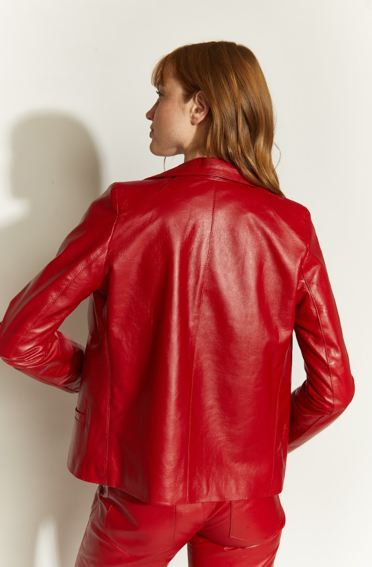 Blazer confeccionado en 100% cuero, seleccionado por su suavidad, flexibilidad y acabado natural. Su forro interior garantiza comodidad y un calce impecable. El tono rojo intenso aporta personalidad y elegancia, convirtiéndolo en una prenda de alto impacto ideal para looks sofisticados o de noche.