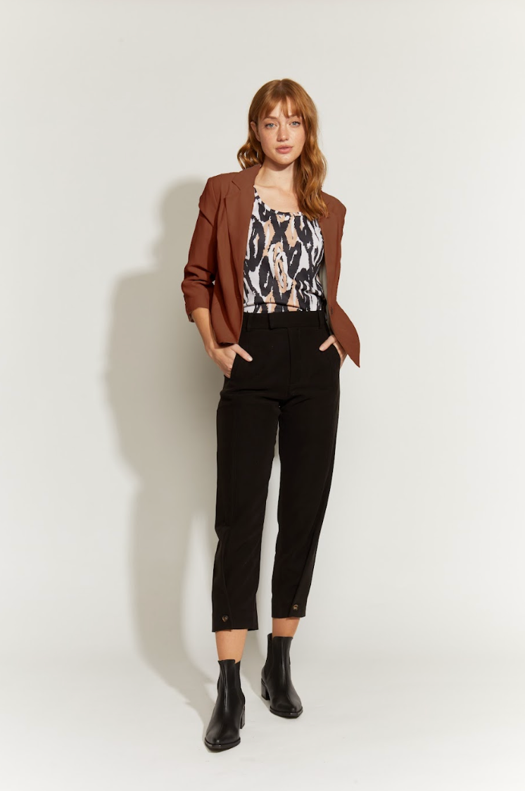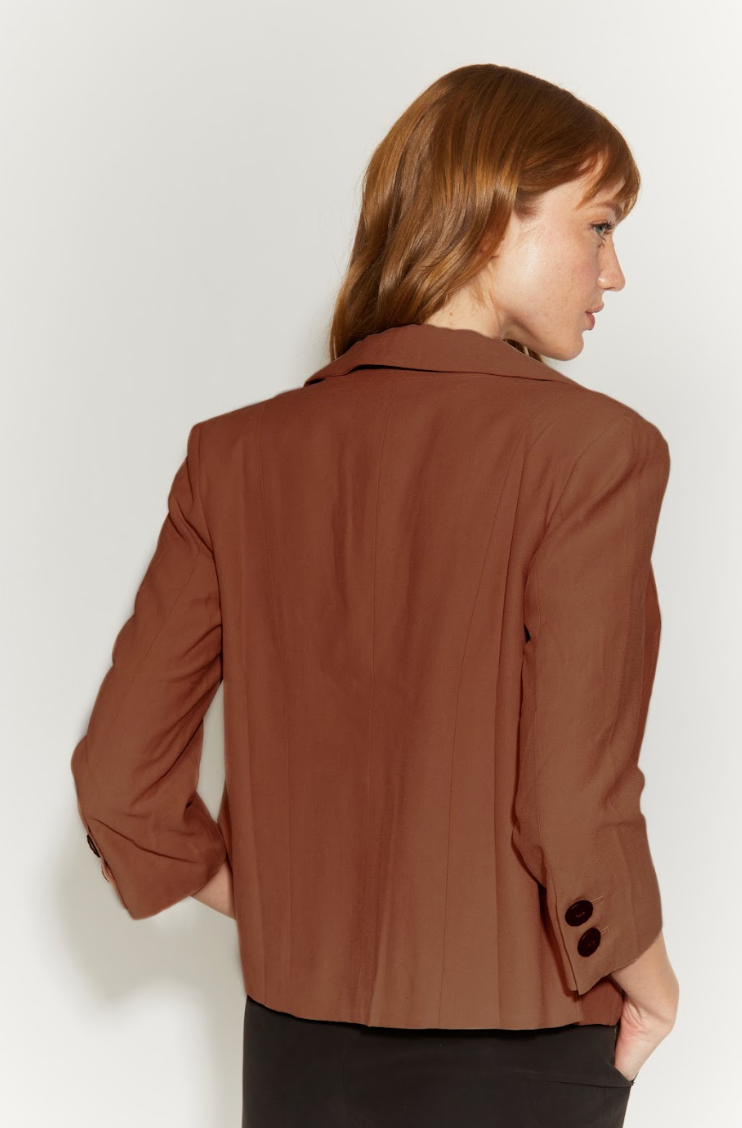Blazer de tencel con detalle manga 2 botones, Hecho en Perú. Su tono marrón neutro y textura suave aportan elegancia y versatilidad.