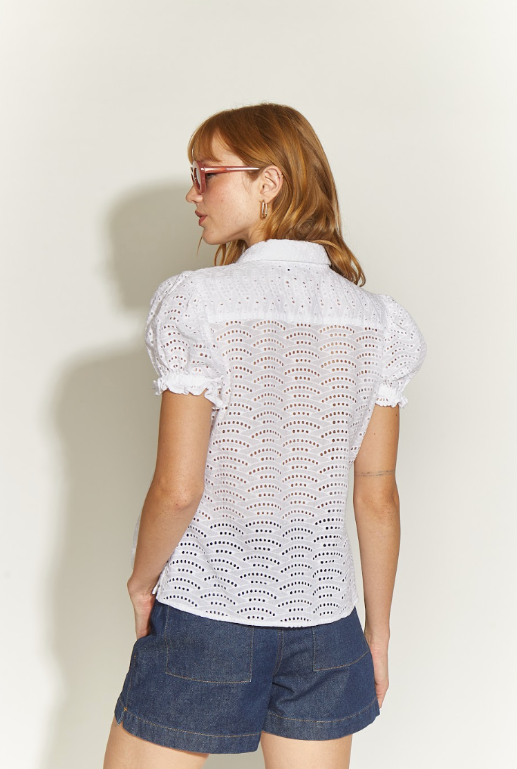 BLUSA LAVANDA BLANCOBlusa 100% algodón de manga corta con delicado frunce en los puños, cuello camisero. Hecho en Perú. Su estructura liviana y diseño femenino la convierten en una prenda ideal para el día. Diseño exclusivo Fernanda Macan.