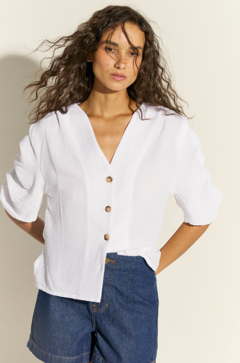Increíble blusa de lino color blanco, cuello en "V", con detalle de botones en el delantero y un recogido de pliegues en las mangas que la hace totalmente única. Tiene una caída que la hace apta para cualquier tipo de cuerpo. Combínalo con nuestras sandalias de cuero o tejidas.