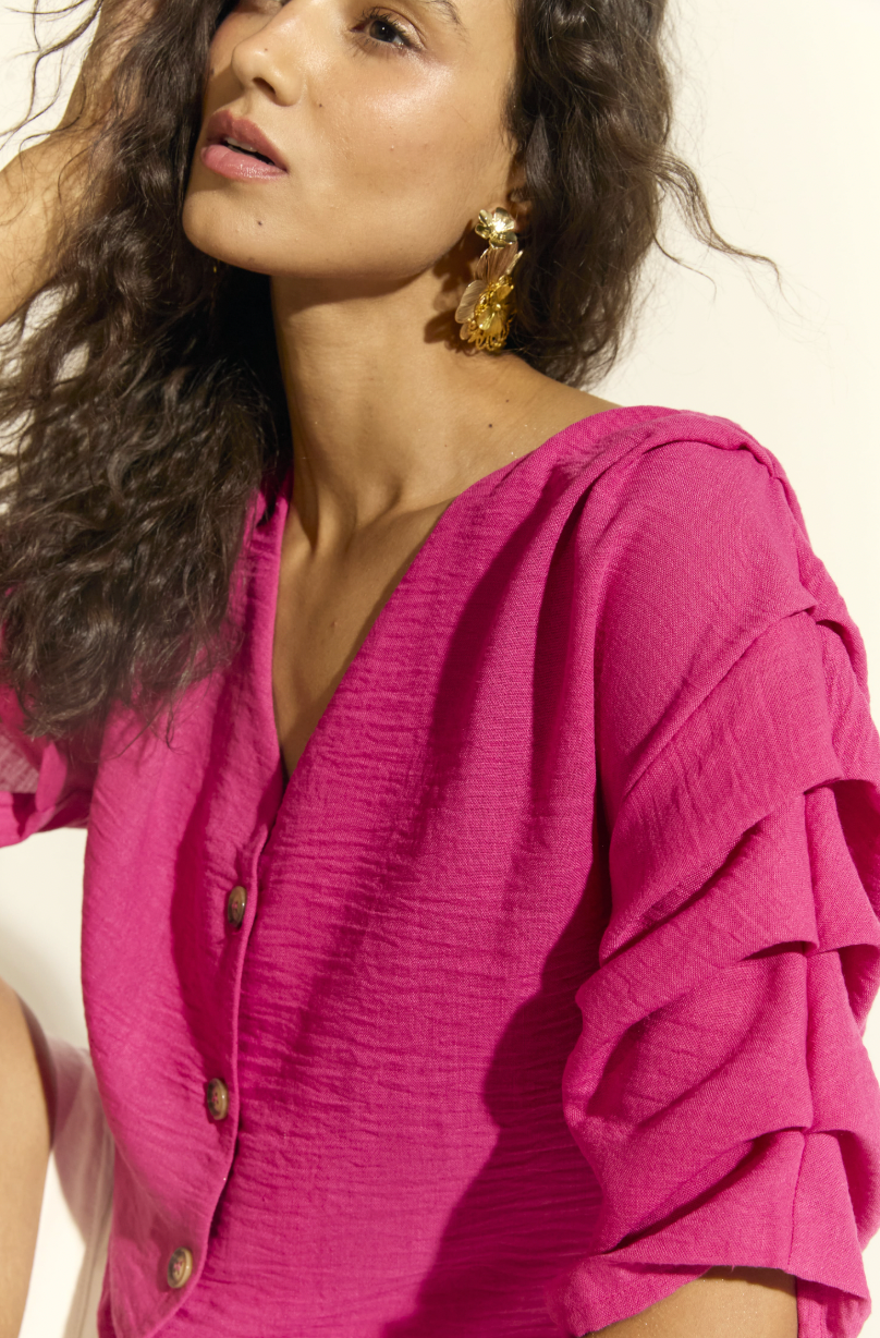 Increíble blusa de lino color fucsia, cuello en "V", con detalle de botones en el delantero y un recogido de pliegues en las mangas que la hace totalmente única. Tiene una caída que la hace apta para cualquier tipo de cuerpo. Combínalo con nuestras sandalias de cuero o tejidas.
