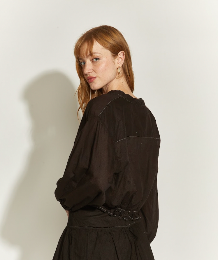 Elegante y atemporal, la blusa Pyma destaca por sus finos pespuntes blancos que realzan su confección impecable. Su diseño minimalista y femenino permite combinarla fácilmente con jeans, pantalones o faldas, adaptándose a distintos estilos y ocasiones.