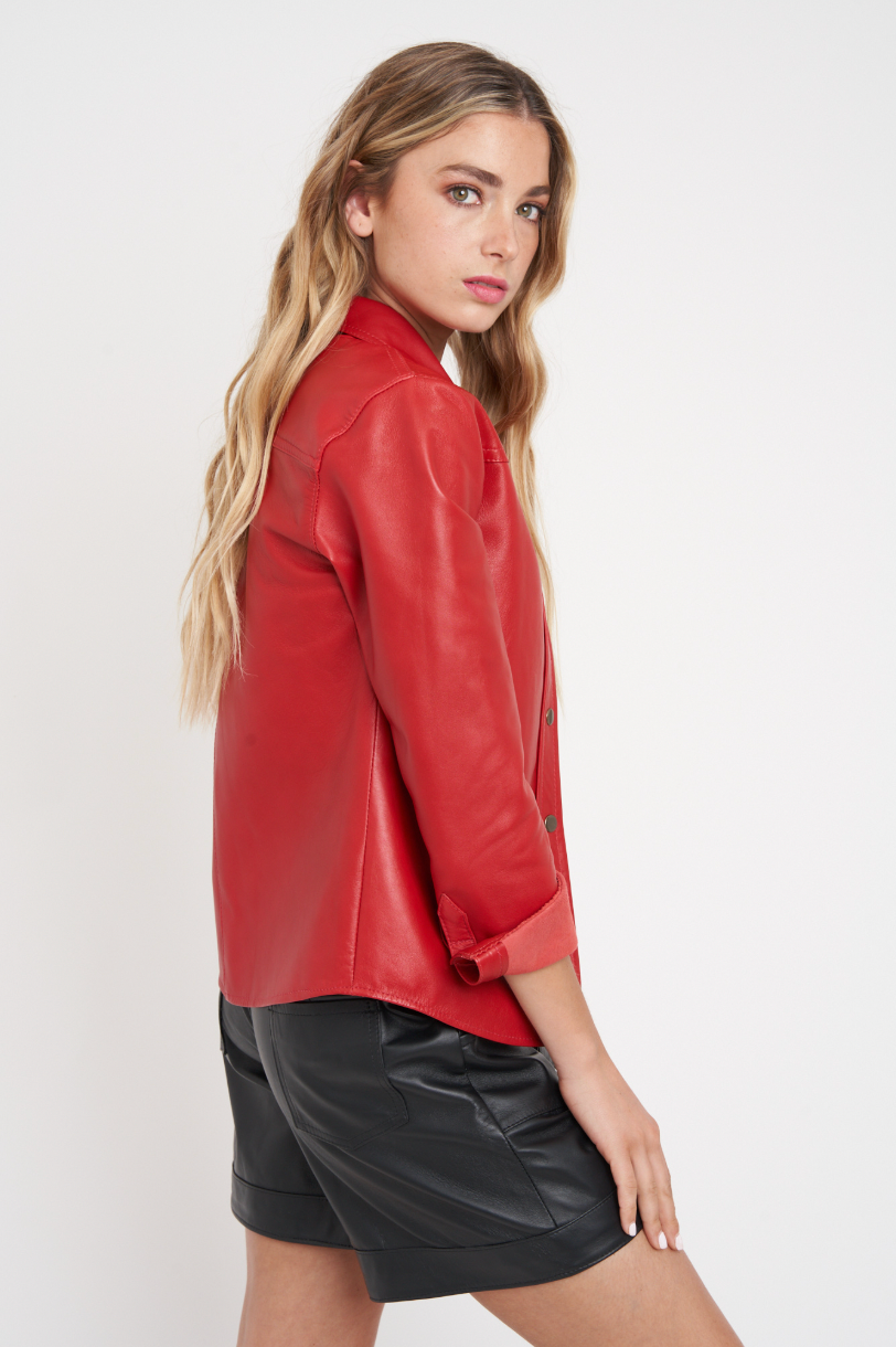 Camisera Jimena roja. Un clásico con carácter propio. Esta camisera roja, confeccionada en 100% cuero, combina elegancia y fuerza en un solo diseño. Sus broches dorados aportan un detalle sofisticado que eleva cualquier look, haciendo de esta prenda una pieza versátil y atemporal para tu guardarropa.