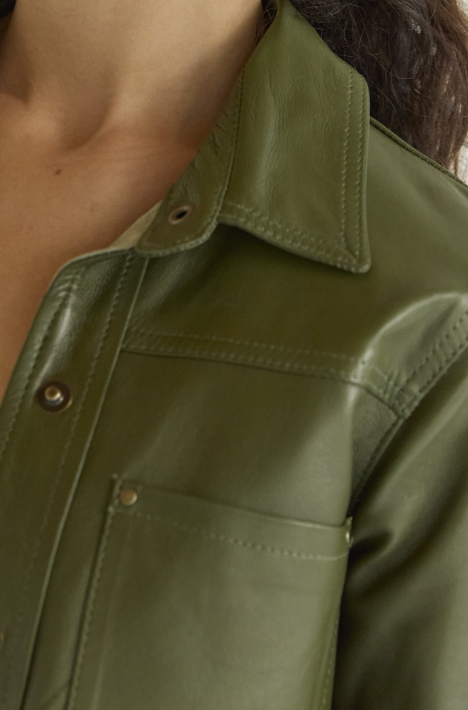 Diseñada en 100% cuero, esta camisera destaca por su silueta atemporal y su acabado en verde musgo, un tono elegante y fácil de combinar. Una prenda versátil que puede usarse como chaqueta ligera o sobrecamisa, aportando carácter y sofisticación a cualquier look.