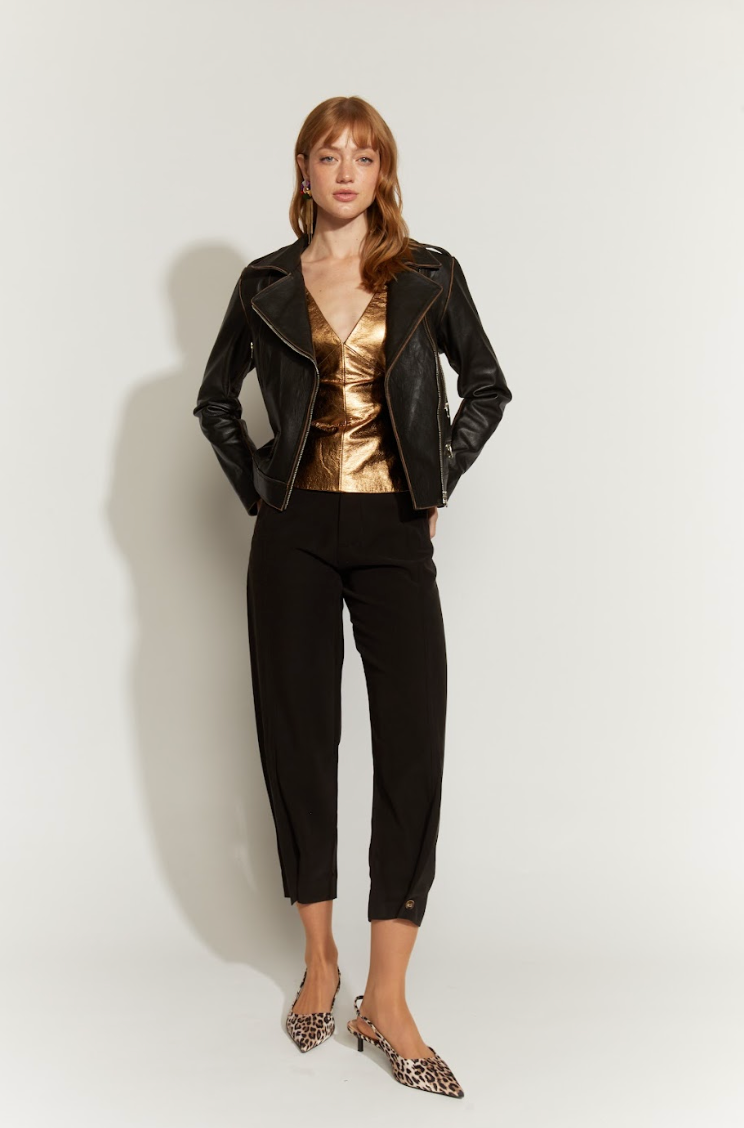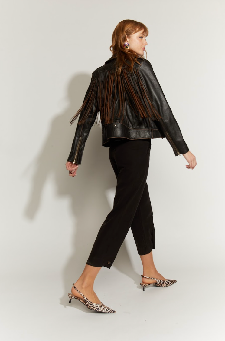 Chaqueta 100% cuero de oveja con acabado gastado y aplicación de flecos en la espalda. Hecho en Perú. Presenta cierre metálico frontal, bolsillos laterales y estructura entallada que realza la silueta. Una prenda de carácter único y estilo contemporáneo.