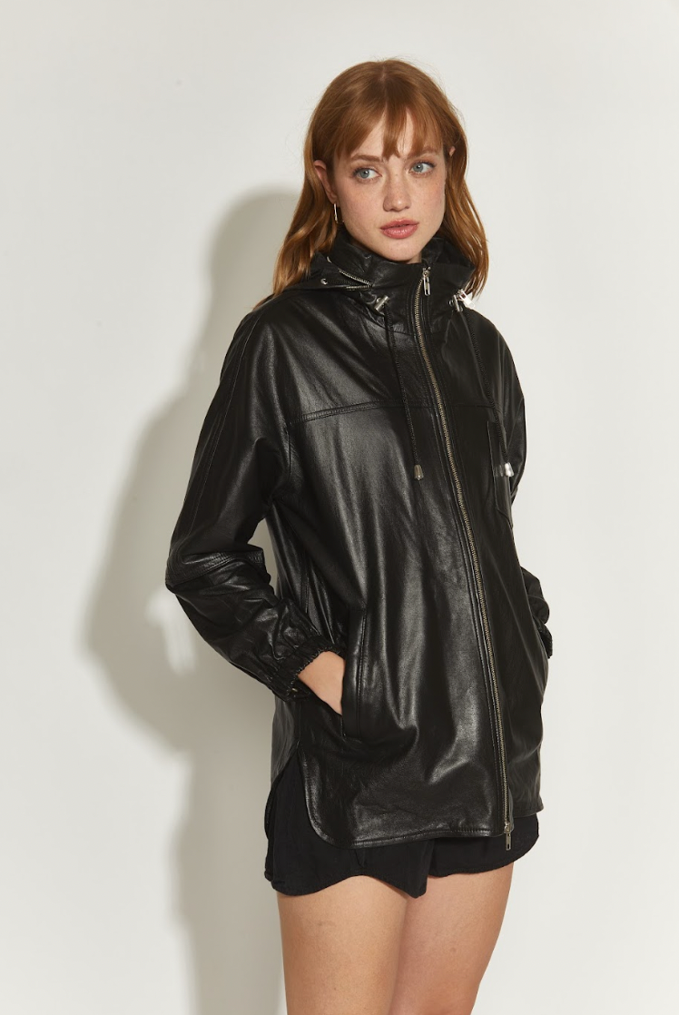 Chaqueta oversize talla única confeccionada en 100% cuero de oveja. Su diseño incorpora un gorro oculto con cierre en el cuello, aportando versatilidad y un toque moderno. De calce amplio y cómodo, es una prenda atemporal que combina estilo y funcionalidad, perfecta para usar en distintas ocasiones y elevar cualquier look con personalidad.