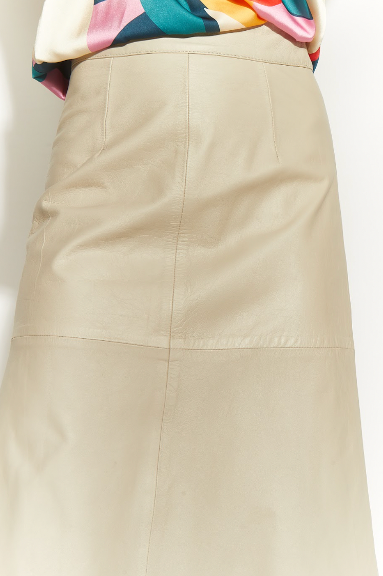 Falda de cuero color hueso tres cuartos. Súper combinable e ideal para las temporadas de media estación. Llévala con nuestras chalecos o blusas y poleras satinadas de la nueva colección Fernanda Macan.