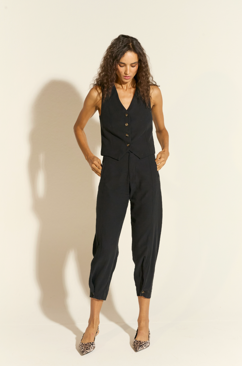 Moderna y sofisticada, la gillette negra con botones se convierte en un esencial de tu guardarropa. Su corte versátil permite usarla sola o como capa sobre camisas y blusas, aportando estructura y estilo a cualquier look.
