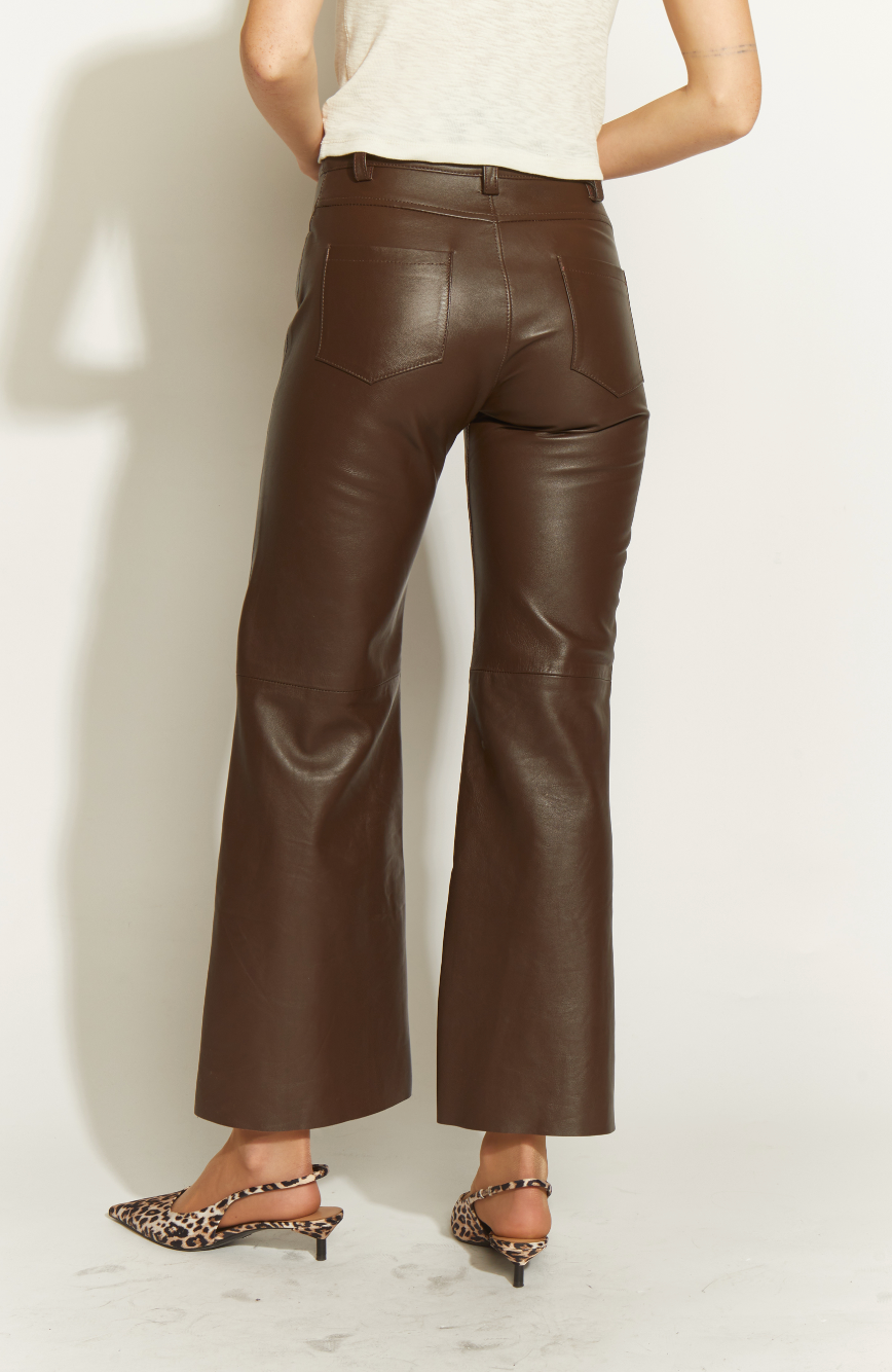 El pantalón Ema 100% cuero en color chocolate combina estilo y comodidad en un corte recto clásico que se adapta a cualquier ocasión. Ofrece un calce perfecto y una sensación de suavidad al tacto.
