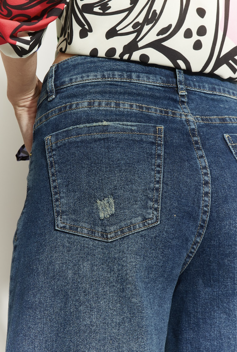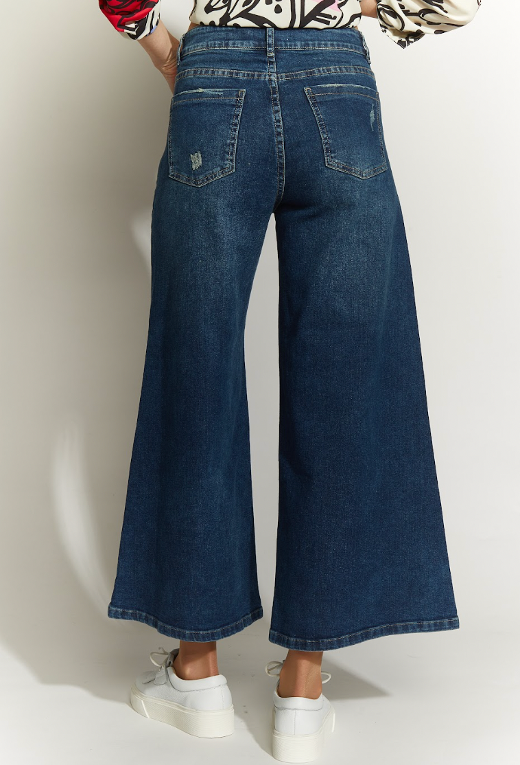 Pantalón denim corto tobillo ancho que aporta estructura y comodidad. De tiro medio y calce recto, presenta terminación al corte y largo sobre el tobillo. Su tono azul clásico lo convierte en una prenda versátil y atemporal, ideal para combinar con blusas, poleras o chaquetas en looks de día o de fin de semana.