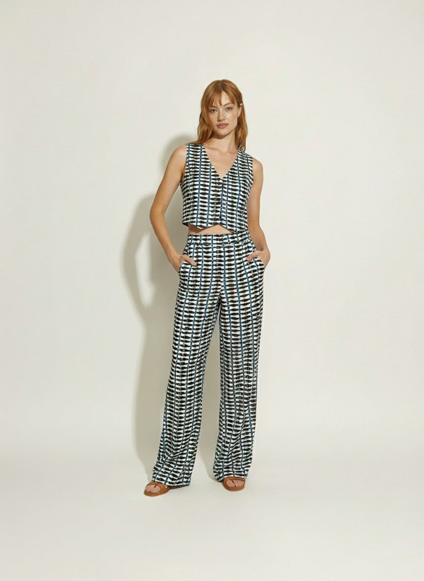 Pantalón de corte recto con estampado en tonos negro, verde y azul. Incluye pinzas y bolsillos laterales. Tela liviana de caída fluida y terminaciones prolijas que aportan elegancia y movimiento.
