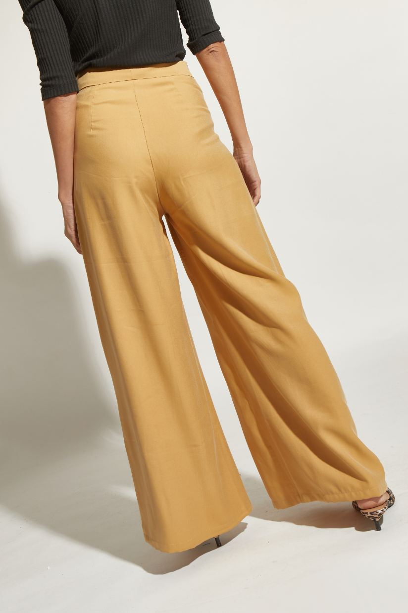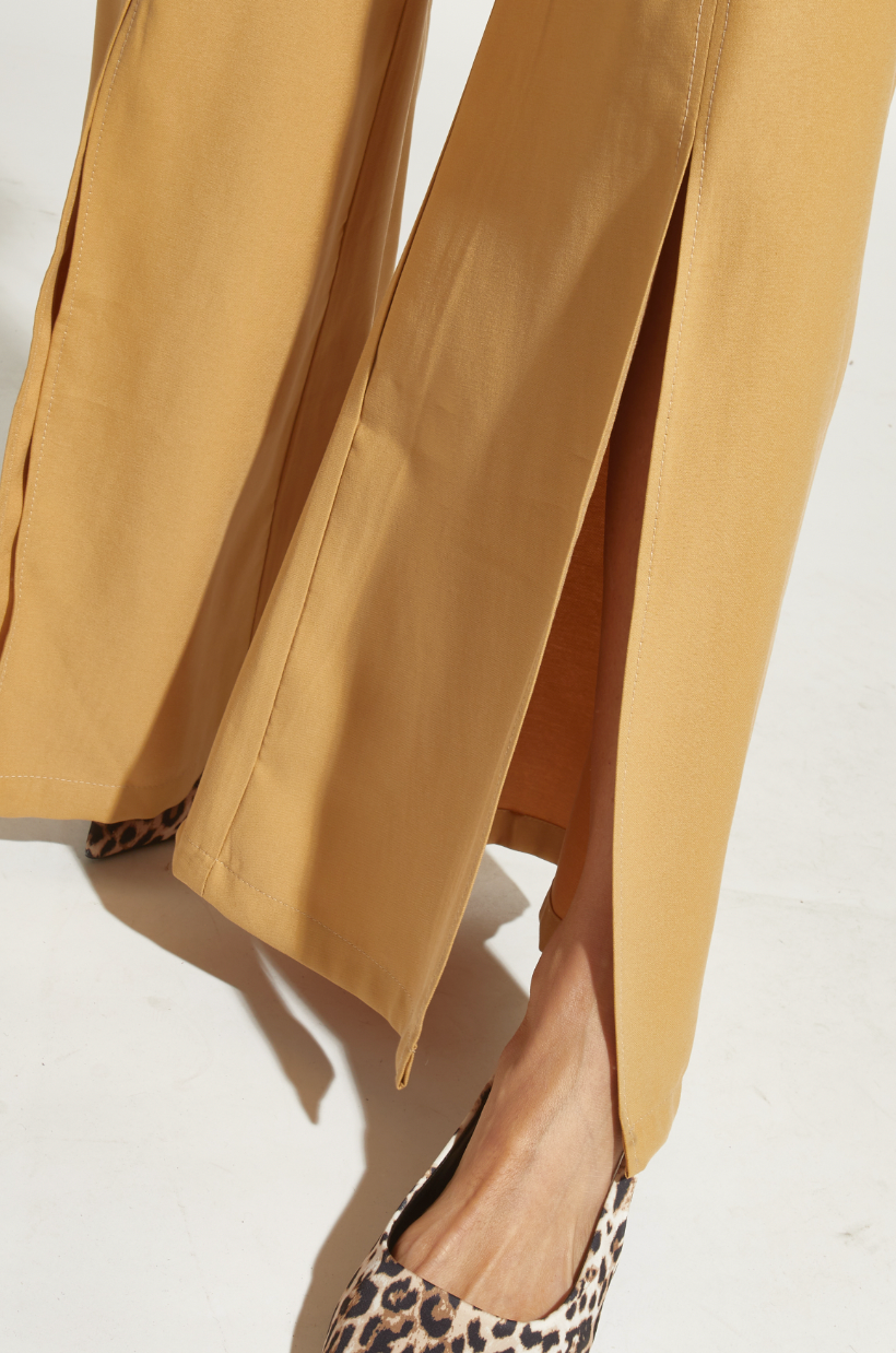 PANTALÓN TENCEL TAJO PIERNA MOSTAZA