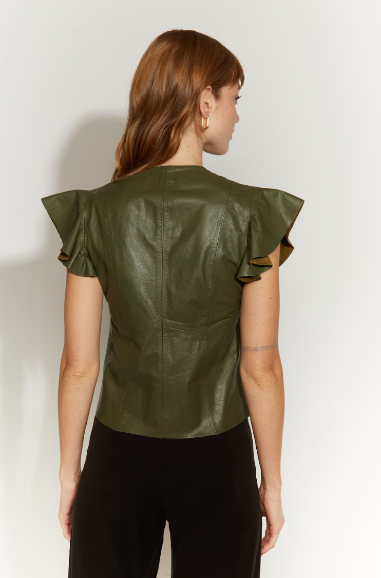 La polera de cuero en color verde olivo combina estilo y originalidad en un diseño único. Sin mangas, cuenta con cierre frontal y mangas vuelo que aportan movimiento y un toque sofisticado. Los detalles en los hombros realzan la silueta y agregan personalidad a la prenda. Confeccionada en cuero de alta calidad, es perfecta para combinar con pantalones o faldas, creando looks modernos y elegantes.