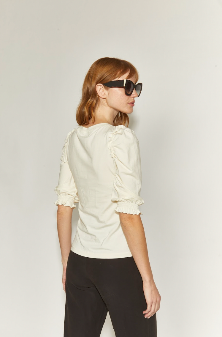 POLERA ROBLE CRUDO Polera 100% Pyma Cotton de manga 3/4 con sutil vuelo en las mangas. Hecho en Perú. Su textura ligera y caída natural. Combínala con prendas de cuero o pantalones tensel para un look contemporáneo y elegante. Diseño exclusivo Fernanda Macan.