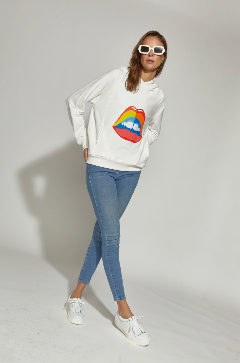 Polerón 100% algodón, de textura suave y calce relajado. Versátil y cómodo, ideal para el uso diario. El estampado de boca en el frente, realizado en serigrafía a mano, aporta un toque único y artesanal.