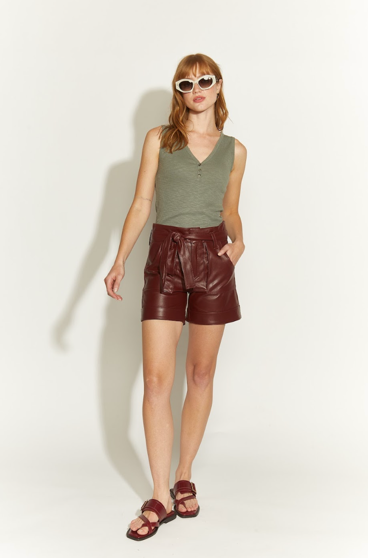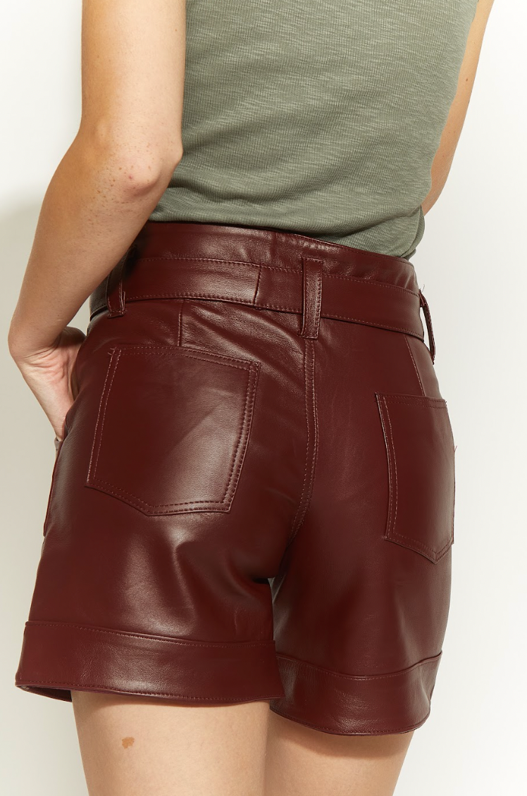 Short 100% cuero de oveja en tono burdeo, con lazo ajustable en la cintura y bolsillos laterales. Combínalo con nuestras poleras básicas y eleva tus días. Diseño exclusivo Fernanda Macan.
