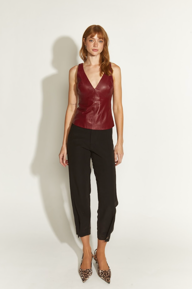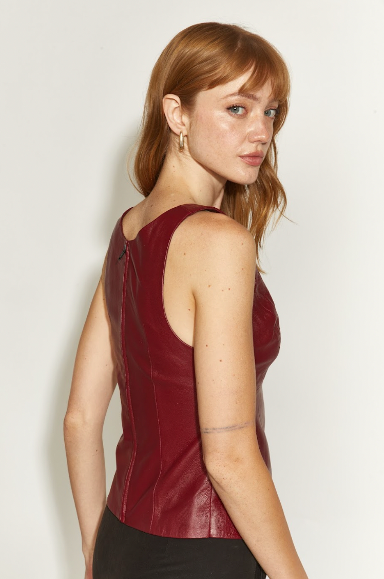 TOP DE CUERO ESCOTE EN V BURDEOTop 100% cuero de oveja, suave y de textura liviano. Presenta escote en V que realza la silueta. Su calce preciso y el tono burdeo aportan elegancia y carácter, ideal para combinar con pantalones o faldas en looks de noche o para ocasiones especiales.