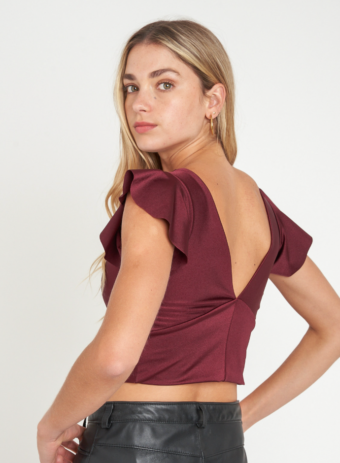 Top confeccionado en lycra suave y elástica, de calce cómodo y femenino. Su diseño destaca por los vuelos en los hombros, que aportan movimiento y un toque elegante. El tono burdeo profundo realza la silueta y entrega un aire sofisticado, ideal para combinar tanto con prendas casuales como de noche.
