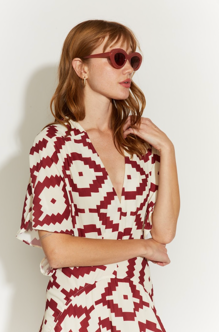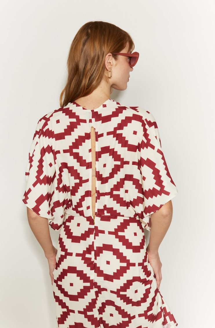 Vestido largo confeccionado en tela liviana con print étnico en tonos burdeos. Hecho en Perú. Su caída fluida y silueta relajada realzan una elegancia natural y versátil. Ideal para el día o la noche. Diseño exclusivo Fernanda Macan.